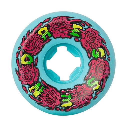 Slimeballs Eric Dressen guest pro Vomit Mini in Turquoise featuring art by Thomas Fernandez @liveradstudios. Vomit mini wheels are a wide asymmetrical shape with a rounded edge on one side and conical edge on the other giving you a choice of lock in feel, with a wide riding surface for control on all terrain.